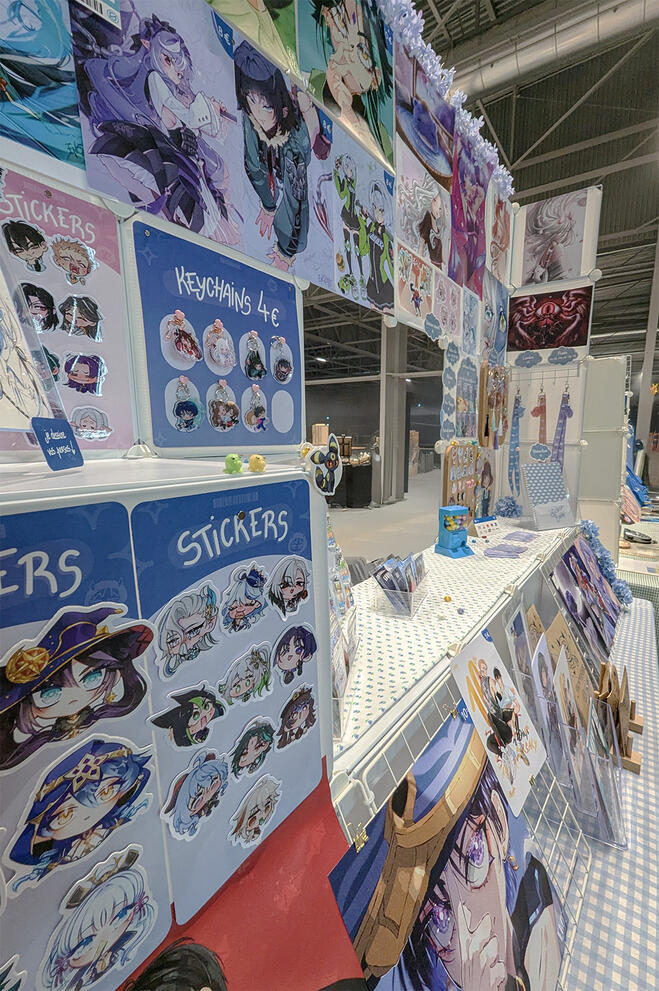 Exposantes depuis 2023, nous nous sommes regroupées pour partager un stand, et ainsi proposer davantage de créations / offrir un catalogue enrichi d’œuvres originales et de fanarts !